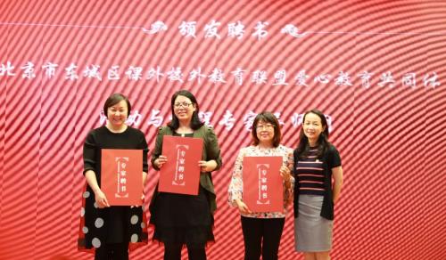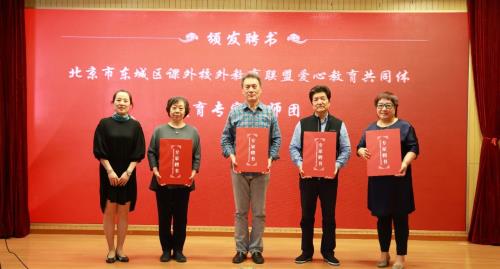 为积极推动爱心教育创新行动计划,吹响爱心教育集结号,更好的推进爱心教育理念的实施落地,提高对爱心教育共同体“爱心共育”课程的认知,爱心教育共同体正式建立专家导师团,包含:中华传统文化导师团、美育导师团、活动与课程导师团。东城区教委校外教育科科长高青、东城区教委校外教育科副科长赵蔓莉、东城区明城青少年年活动中心主任吴玥分别对导师团专家代表颁发聘书。